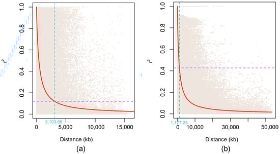 Linkage disequilibrium measures (r2) against physical distance between pairs of SNP markers in kilobases. The purple dotted line denotes the critical r2 value, while the turquoise line indicates the physical distance the critical value reaches. (a) The LD decay pattern for the original population and (b) the pattern for the ENMR15 core collection.