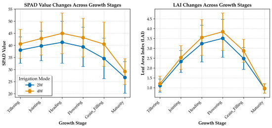 Temporal dynamics of SPAD values (left) and LAI (right) in spring wheat under two irrigation regimes (2W: limited irrigation; 4W: conventional irrigation) across six growth stages from tillering to maturity. Error bars represent standard error of the mean.