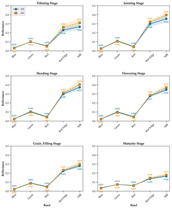 Spring wheat canopy reflectance exhibited typical vegetation spectral patterns across growth stages while revealing important differences between irrigation treatments (Figure 3). Both treatments showed low reflectance in visible wavelengths, a sharp increase in the red edge region, and high reflectance in NIR. The blue band maintained consistently low reflectance (0.021–0.035) with minimal treatment differences. The green band displayed the characteristic “green peak.” Red band reflectance remained low (0.036–0.060) due to chlorophyll absorption. The most significant treatment differences appeared in red edge and NIR regions, where 4W consistently exhibited higher reflectance, particularly during heading and flowering stages. Temporally, NIR reflectance increased from tillering to heading/flowering before declining during grain filling and maturity, corresponding to canopy development and senescence. During maturity, reflectance decreased across all bands, with treatment differences diminishing as canopy characteristics converged during senescence.