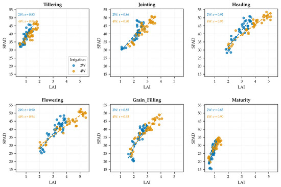Relationship between LAI and SPAD values across six growth stages under limited irrigation (2W, blue circles) and conventional irrigation (4W, orange circles). Correlation coefficients (r) for each irrigation treatment are shown in the upper left corner of each plot. Dashed lines represent linear regression fits.