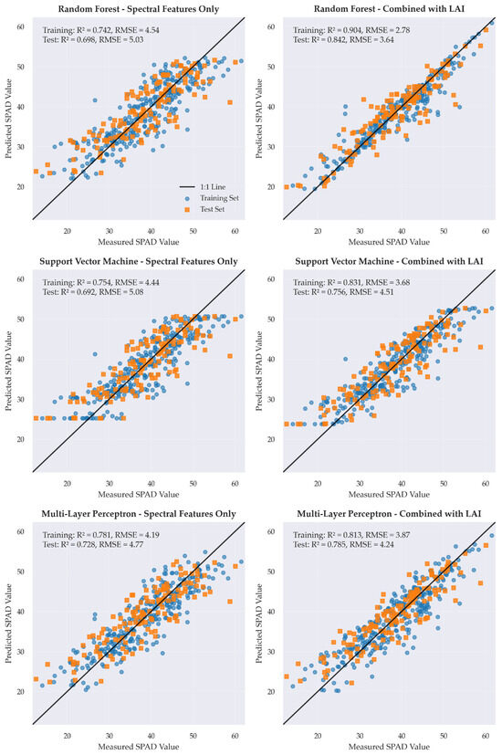 All three machine learning algorithms showed significant performance improvements when LAI was integrated with spectral features for SPAD estimation (Figure 5). Random Forest Regression (RF) demonstrated the most substantial gains on the independent test dataset, with test R2 increasing from 0.698 to 0.842 (+20.6%) and test RMSE decreasing from 5.025 to 3.640 (−27.6%). Support Vector Regression (SVR) showed more modest test set improvements (test R2 from 0.692 to 0.756, +9.2%; test RMSE from 5.078 to 4.514, −11.1%), while Multi-Layer Perceptron (MLP) achieved intermediate enhancements on the test data (test R2 from 0.728 to 0.785, +7.8%; test RMSE from 4.770 to 4.237, −11.2%). The combined RF model delivered the best overall performance on unseen test samples, suggesting its superior ability to capture complex non-linear relationships between canopy structure, spectral properties, and chlorophyll content. All models demonstrated good generalization capability when evaluated on the independent test set, confirming the value of integrating LAI with spectral data for more accurate SPAD estimation in spring wheat under field conditions.