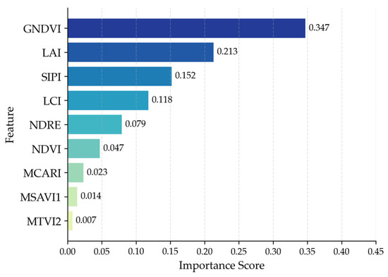 Feature importance analysis of the optimal Random Forest model revealed the relative contribution of each input variable to SPAD estimation accuracy (Figure 6). GNDVI emerged as the most influential feature with an importance score of 0.347, accounting for approximately 35% of the model’s predictive power. This finding aligns with the strong correlation between GNDVI and SPAD observed in the correlation analysis. LAI ranked as the second most important feature with a score of 0.213, highlighting its substantial contribution to SPAD estimation despite not being a spectral index. This significant ranking validates the integration of structural parameters with spectral information for improved model performance. Combined, GNDVI and LAI accounted for more than 55% of the total feature importance, demonstrating their dominant role in SPAD estimation for spring wheat.