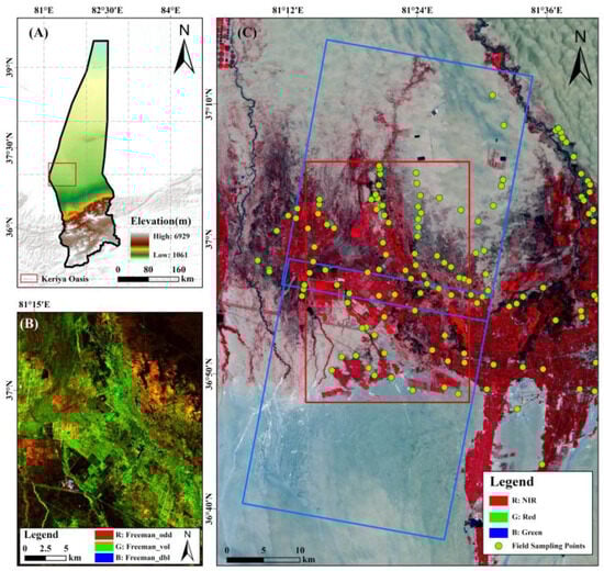 Location map of the study area. (A) DEM data of the Keriya Oasis; (B) Subset images in Freeman decomposition; (C) Sentinel-2 false-color optical imagery and field sampling sites.
