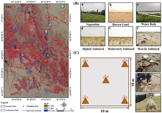 Considering the unity of pixels and vegetation types, the same feature, about 100 m2 of flat sample patches, was selected for sampling, with five sampling points in each patch. In each sampling area, three soil samples were obtained, resulting in a total of 15 soil samples per patch (Figure 2C). Soil salinity and other physicochemical characteristics were measured under laboratory conditions after sampling from the soil surface (0–10 cm). After air-drying and passing through a 1 mm sieve, the soil samples were mixed with distilled water at a 1:5 ratio in a flask. The flask was shaken by hand for 3 min to allow complete penetration of the soil. The well-mixed solution was then allowed to stand for 30 min. The supernatant was subsequently used to measure electrical conductivity (EC) with a calibrated conductivity meter (Multi 3420 Set B, WTW GmbH, Munich, Germany), following standard procedures [66]. The EC value for each sampling area was obtained by averaging the EC values of the 15 soil samples, and different degrees of salinization were determined according to the surface soil salt concentration and vegetation cover.