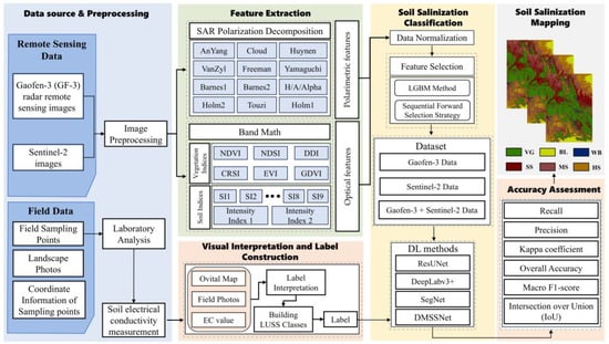 DL methods have been widely applied within the scope of RS. However, the amount of RS data is often limited. In specific applications, such as semantic segmentation, it is crucial to generate task-specific training samples [67]. The production of representative training samples is important for building a high-quality dataset [68]. However, existing open-source datasets often do not meet the task requirements for salinized soil classification based on radar images. Therefore, it is necessary to manually establish labeled datasets to fulfill these requirements [69].