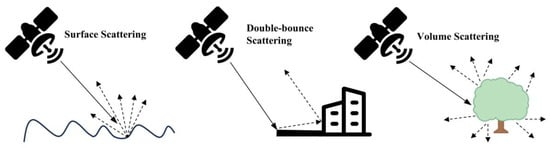 Polarimetric decomposition is a key technique in PolSAR image analysis, allowing the complex scattering process to be separated into distinct components represented by corresponding scattering matrices [84]. This enables the extraction of polarization scattering characteristics and the accurate retrieval of surface physical properties, thereby improving image interpretation and classification accuracy [85]. SAR scattering mechanisms are generally categorized into three types: surface scattering, double-bounce scattering, and volume scattering [86]. Surface scattering is generally linked to smooth or barren soil; double-bounce scattering occurs in areas with vertical structures such as urban environments or tree trunks, whereas volume scattering is dominant in vegetated regions due to canopy complexity [87]. These distinct scattering behaviors, illustrated in Figure 5, reflect the interaction between SAR signals and various land surface targets. Understanding these scattering mechanisms is essential for extracting polarization-based features, improving the discrimination of salinized soils and land cover types, and enhancing the accuracy of multi-source data fusion in soil salinization and land use classification tasks.