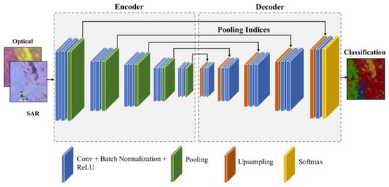 SegNet is a fully convolutional deep neural network specifically designed for pixel-wise semantic segmentation [101] (Figure 6). The encoder captures multi-level features, while the decoder restores spatial resolution using the max-pooling indices from the encoder, thereby preserving boundary information and reducing detail loss. This structure makes SegNet particularly effective in RS applications, including building extraction [102], water body segmentation [103], and land use and land cover classification [104].