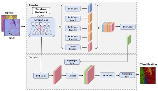 DeepLabv3+ is a state-of-the-art deep learning model for semantic segmentation, integrating multi-scale feature extraction and precise boundary recovery [107]. In this study, we customize DeepLabV3+ with a ResNet18 backbone to efficiently extract hierarchical features (Figure 8). The Atrous Spatial Pyramid Pooling (ASPP) module enhances multi-scale context learning by employing 1 × 1 and 3 × 3 dilated convolutions, capturing both fine details and broad contextual information. The decoder module refines segmentation maps using a 3 × 3 convolution, followed by bilinear upsampling to restore spatial resolution. This architecture effectively balances computational efficiency with segmentation accuracy, making it well-suited for soil salinization and land use classification.