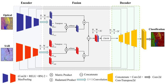 This multimodal fusion approach enables a more comprehensive extraction of information from both data sources, leveraging complementary spectral and scattering characteristics to enhance segmentation performance.