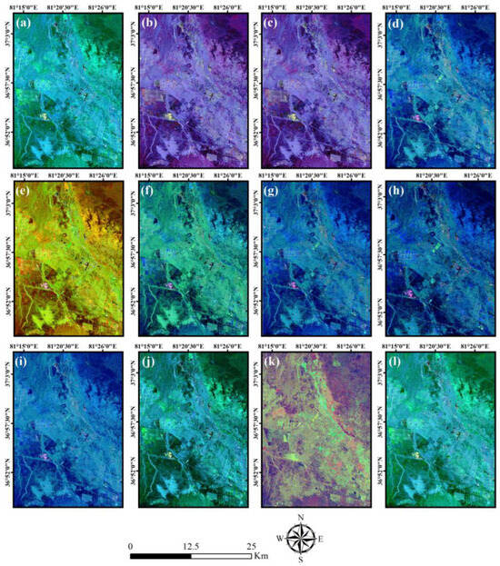 Synthetic Aperture Radar (SAR) provides continuous earth observation capabilities, unaffected by weather conditions or cloud cover, enabling day-and-night monitoring [17]. Moreover, SAR backscatter is highly sensitive to soil electrical conductivity (EC), which is strongly influenced by salinity levels [18,19,20]. Consequently, SAR has the potential for effective application in soil salinity monitoring [18]. Polarimetric Synthetic Aperture Radar (PolSAR) is an advanced imaging radar system characterized by its multi-channel and multi-parameter capabilities [21]. It acquires information from electromagnetic waves that are transmitted toward target objects and subsequently reflected to the sensor. The received signals provide rich target-specific scattering characteristics [22]. By using PolSAR, we can obtain more complete polarimetric scattering characteristics of targets than using single-polarization radar, making PolSAR a significant part in obtaining a variety of details such as physical dielectric characteristics, geometric shapes, and target directions of ground objects [23]. It enhances the radar’s capability to obtain target information [23,24,25]. At the same time, polarization decomposition is utilized to extract target features from the polarimetric SAR data that meet the classification criteria, thereby enabling more accurate target classification and recognition [26]. It has found extensive application in land cover monitoring [27,28,29], target detection [30,31,32], and terrain classification [33,34,35,36].