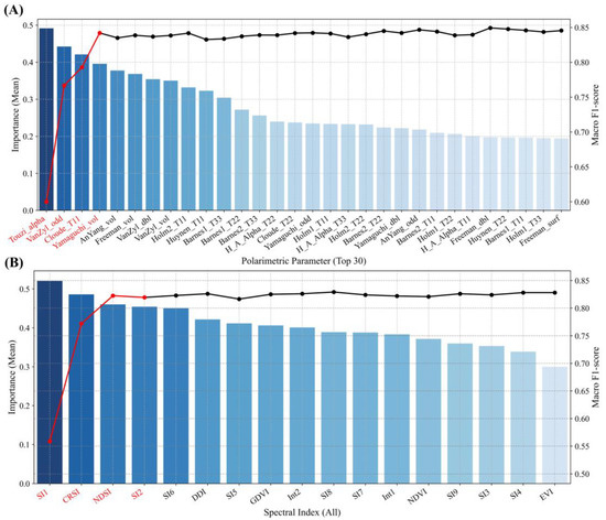 In this study, multidimensional features were extracted to enhance classification performance. However, certain features may exhibit redundancy and strong correlations, which affect the efficiency and effectiveness of the classification process [83]. Additionally, despite filtering and denoising the GF-3 data, some features still retain speckle noise, which directly impacts classification results and increases processing time [97]. This paper proposes a hybrid feature selection technique by combining the LightGBM (LGBM) classifier and Sequential Forward Selection (SFS). Ref. [98], leveraging their complementary strengths. LGBM, a gradient-boosting framework, is commonly employed in feature selection because of its efficiency and excellent predictive performance [99,100]. The extracted features were divided into two independent datasets: optical indices and radar polarimetric parameters. Gradient-boosted decision tree models were constructed separately for each dataset using LGBM. Feature importance scores were calculated based on information gained and ranked to complete the initial screening. From the initial ranking, the features were ranked for further analysis. SFS was then applied to these candidates, with model performance assessed at each step. The selection process continued until the optimal subset of features was identified, resulting in a compact and highly informative feature set suitable for subsequent modeling.