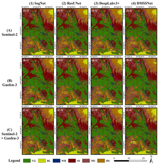 To fully exploit and extract the physical scattering information and the spectral characteristics, while effectively integrating these two independent RS modalities, the DMSSNet network was constructed and shown in Figure 9. Most conventional attention mechanisms cannot generate high-dimensional joint representations that effectively capture both intra-modal spatial relationships and inter-modal complementary information. In this study, the DMSSNet integrated both broad contextual context and detailed features, leading to improved segmentation performance.