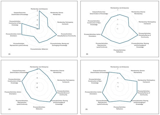 Group Evaluation spider plots based on the brokerage meetings: (A) Egypt, (B) Kenya, (C) Ethiopia, and (D) Sudan.
