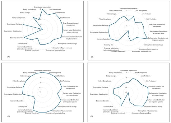 Needs’ Evaluation spider plots based on the brokerage meetings: (A) Egypt, (B) Kenya, (C) Ethiopia, and (D) Sudan.