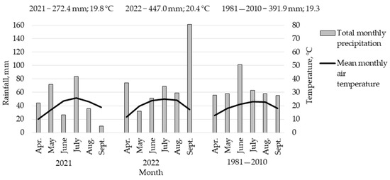 For the long-term reference period of 1981–2010, the total rainfall amount and average annual temperature were 391.9 mm and 19.3 °C; for 2021, 272.4 mm and 19.8 °C; and for 2022, 447.0 mm and 20.4 °C (Figure 1). Therefore, the total seasonal rainfall of 447 mm for 2022 was 14.1% above the long-term period average of 391.9 mm and 64.1% above the 2021 average of 272.4 mm. In contrast, the total seasonal rainfall of 272.4 mm in 2021 was 31% lower than in the long-term reference period. In 2021, there were dry periods in June (intensive stem growth), August, and September (dough stage (R4) and physiological maturity (R6)). In 2022, the meteorological conditions were favorable for maize growth.