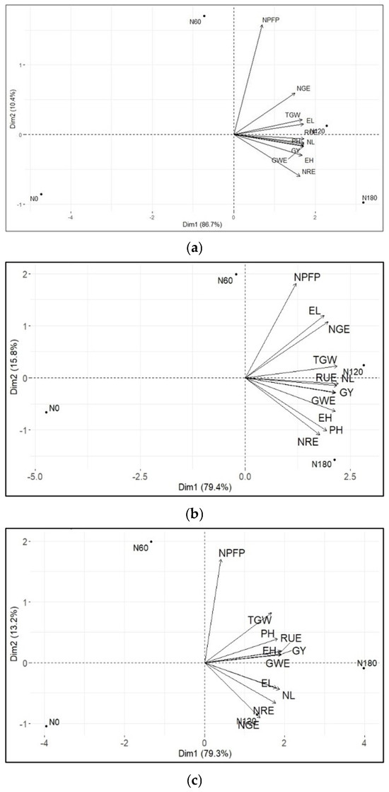 (a) Principal component analysis (PCA) of morphological and yield components traits, yield, RUE, and NPFP based on different N rates; PH—plant height; EH—ear height; NL—number of leaves per plant; EL—ear length; NRE—number of rows per ear; NGE—number of grains per ear; GWE—grain weight per ear; TGW—1000-grain weight; GY—grain yield; RUE—rain use efficiency; NPFP—N partial factor productivity; N0—0 kg N ha−1; N60—60 kg N ha−1; N120—120 kg N ha−1; N180—180 kg N ha−1; (b) vector plot of variables for ZP666, (c) vector plot of variables for NS6030.