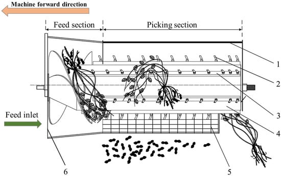 Structure and working principle diagram of picking device. 1. Top cover; 2. Flat pin teeth; 3. Width plate; 4. Picking drum; 5. Concave screen; 6. Feed inlet.