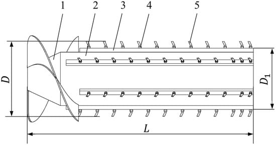 Structure diagram of full-feeding peanut picking drum. 1. Screw feed head; 2. Drum body; 3. Plate; 4. Picking component mounting base; 5. Picking component.