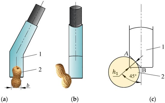 Conventional bent cylindrical bar teeth top inverted radius is very small, the collision cross-section area is small, the peanut pods’ impact is intense, and there is a sliding cut role, which easily causes the peanut pods’ higher breakage rate. Increasing the impact contact area is an effective means of reducing mechanical damage to peanut pods. Flat pin teeth increase the contact area of the nail teeth and peanut pods collision, and the top with inverted transition, so that the flat pin teeth and peanut pods form the approximate spherical contact, peanut pods force uniformity increases, and the impact cross-sectional area is large, so as to reduce the breakage rate of peanut pods. Under the same test conditions, flat pin teeth and peanut pods’ impact cross-sectional area s2 is greater than the conventional bent cylindrical bar teeth and peanut pods’ impact cross-sectional area s1. Equations (6) and (8) can be obtained from the following relationship: