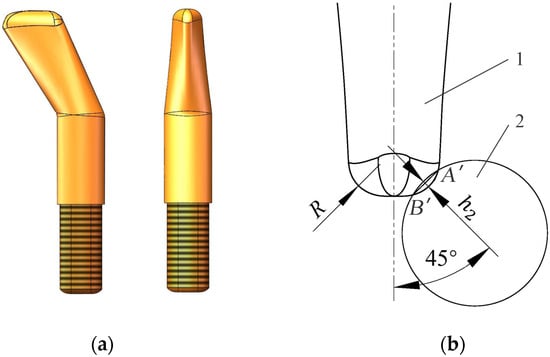 In order to increase the contact area between the flat pin teeth and the peanut pods at the impact surface, thereby reducing the rigid impact strength of the peanut pods, decreasing the breakage rate of the peanut pods and improving the quality of picking. In this study, the tip of the flat pin teeth was designed as a flat sphere. The collision between the flat pin teeth and the peanut pods is shown in Figure 5.