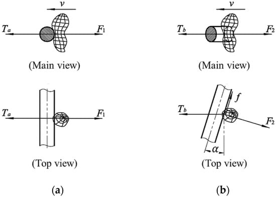 Under the same conditions, it can be approximated that the collision impact force Ta of the peanut pods on the straight transverse circular steel is equal to the collision impact force Tb of the peanut pods on the right-oriented type transverse circular steel. It is also obtained from Equations (11) and (12):