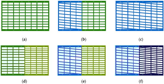 The schematic diagram of different types of peanut picking concave screen and combination form. (a) Conventional straight and horizontal round steel density consistent type; (b) Right round steel + straight round steel density consistent type; (c) Right round steel density consistent type; (d) Straight and horizontal round steel front sparse and back dense type; (e) Right round steel + straight round steel front sparse and back dense type; (f) Right round steel front sparse and back dense type.