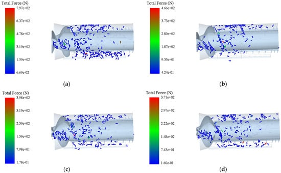 Simulation analysis of different picking components. (a) Flat pin teeth with 5 mm chamfer radius; (b) Flat pin teeth with 6 mm chamfer radius; (c) Flat pin teeth with 7 mm chamfer radius; (d) Conventional bend cylindrical bar teeth.