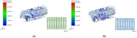 Based on preliminary experiments and literature review, the destructive force required to fracture peanut pods after 3–5 days of field drying ranges from 56.82 to 197.09 N [29], while the breaking force required for the separation of peanut pods from the vine ranges from 7.06 to 25.84 N [30,31]. At high drum speeds, the collision force exerted by the straight round steel concave screen on peanut pods exceeds the lower limit of the destructive force for pod breakage, while the collision force from the right round steel concave screen remains below the pod’s destructive force range. At low drum speeds, the collision force from the straight round steel concave screen is comparable to the destructive force of the peanut pods, while the collision force from the right round steel concave screen remains below the destructive range. Furthermore, under the tested drum speeds, the collision forces of both types of concave screens exceed the upper limit of the breaking force required for separating peanut pods from the vine (25.84 N), indicating that both types of concave screens are capable of meeting the peanut picking requirements.
