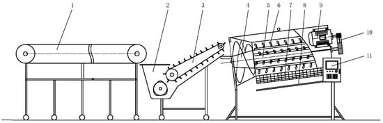 Structure diagram of axial flow peanut picking test bench. 1. Material conveyor belt; 2. Feeding auger; 3. Chain target lifter; 4. Screw feeder; 5. Picking roller; 6. Picking component; 7. Picking concave screen; 8. Material collection plate; 9. Spindle motor; 10. V-belt; 11. Electrical control box.