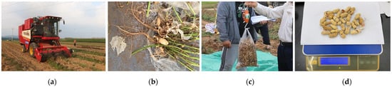 Field experiment. (a) Operation of the peanut picking combine harvester; (b) Unpicked peanut pods; (c) Sampling and weighing of peanut pods; (d) Weighing of broken peanut pods.