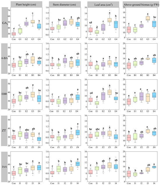 To compare relative effects of various hormones on the plant morphological indices, the most-effective hormone dose was determined primarily based on biomass, as well as plant height, stem diameter, and leaf area, as shown in Figure 2. The identified most-effective doses were GA3 200 mg/L, 6-BA 100 mg/L, EBR 1 mg/L, ZT 20 mg/L and IAA 150 mg/L. Their effects are summarized in Table 2. Among these, GA3 had the strongest effects on biomass and overall growth, while EBR, ZT, and IAA increased biomass, 6-BA enhanced plant height, IAA primarily promoted stem diameter, and both 6-BA and IAA enlarged leaf area.