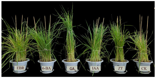 To investigate the effects of exogenous hormones on the growth and adaptation of E. sibiricus, our group preliminary explored the impacts of exogenous phytohormones on the growth and development of Elymus sibiricus. Results showed that exogenous hormones can significantly affect the plant’s growth and nutrient absorption [25,26]. However, previous research only focused on IAA and 6-BA, and further investigation is needed to determine which specific hormone(s) at particular concentrations exert the most pronounced effects on plant growth and development. In this study, Elymus sibiricus ‘Qingmu No. 2’ was employed as the experimental material to systematically evaluate the effects of exogenous hormone types and concentration gradients on aboveground morphological traits, key physiological parameters as well as endogenous hormone levels. The research aims to enhance E. sibiricus yield and provide theoretical support for further artificial grassland cultivation optimization.
