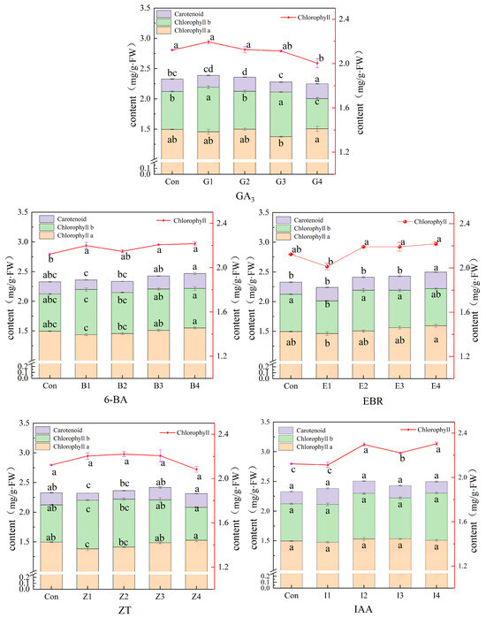 As shown in Figure 3, compared to the control, GA3 at 300 mg/L significantly reduced chlorophyll content (the sum of chlorophyll a, b, and carotenoid). In contrast to GA3, all tested concentrations of 6-BA except for 10 mg/L, EBR at 10 mg/L, and IAA at concentrations higher than 10 mg/L significantly increased chlorophyll content, whereas ZT had no significant effect on it. Specifically, chlorophyll a content significantly increased under treatments with 6-BA at 150 mg/L and EBA at 10 mg/L treatment (p < 0.05). Moreover, chlorophyll b content reduced by 20.46% than CK under GA3 treatment at 300 mg/L (p < 0.05). Carotenoid levels showed significant elevation with GA3 (300 mg/L) and EBR (100 and 150 mg/L) applications. These results demonstrated that 6-BA, EBR, and IAA effectively enhanced chlorophyll biosynthesis at specific concentrations.
