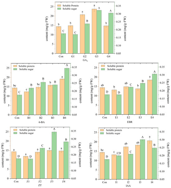 Effects of different concentrations of plant exogenous hormones on sugar and soluble protein contents of Elymus sibiricus. Note: Based on Tukeys test. The lowercase letters indicate that there was a significant difference in soluble protein (p < 0.05) between hormones. Capital letters indicate that there were differences in soluble sugar levels between hormones (p < 0.05).