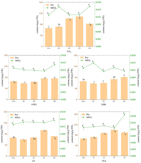 Effects of plant exogenous hormones on MDA and Pro contents of Elymus sibiricus. Note: Based on Tukeys test. Different lowercase letters indicate significant differences between hormone levels (p < 0.05).