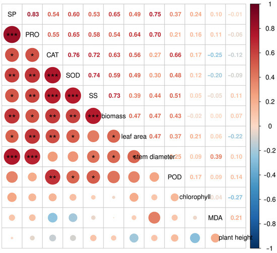 Correlation analysis among various morphological and physiological indices. Note: SP: Soluble protein; PRO: Proline; CAT, catalase; SOD, superoxide dismutase; SS: Soluble sugar; POD, peroxidase; MDA: Malondialdehyde. *, ** and *** significant at 5%, 1% and 0.1% levels, respectively.