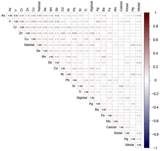 Spearman matrix of bivariate non-parametric correlations between total cadmium (Cd) content and total content of 22 metals and metalloids determined by ICP-MS. Only statistically significant correlations (p < 0.01) are displayed.