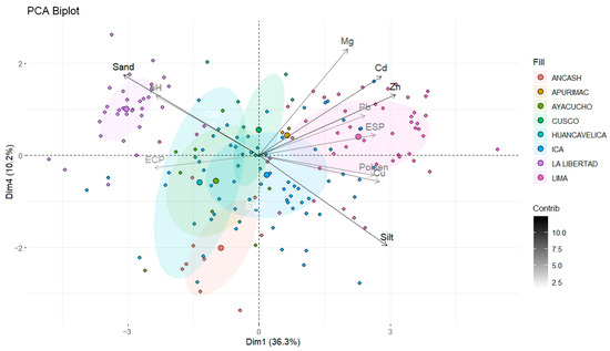 The clustering analysis using ellipses, with the department of origin as a categorical variable, revealed notable patterns. The department of Lima (pink ellipse) showed a pronounced orientation to the right (Dim1) of the graph, influenced by the high values of Cd, Zn, Mg, and the ESP. In contrast, the departments of Huancavelica (light blue ellipse), Ayacucho (green ellipse), and Ancash (red ellipse) displayed considerable overlaps, with the centroids positioned closely together, indicating similar soil profiles among these regions. These three departments exhibited an inclination toward variables negatively associated with component 1, such as the pH, sand content, and ECP. However, the presence of both high- and low-Cd-content hotspots cannot be ruled out, as the proximity of their centroids to the origin of the biplot suggested a multivariate profile not determined by compositional extremes but by an intermediate balance of variables. In the case of Ica (blue ellipse), the ellipse was oval-shaped and parallel to Dim1, indicating low internal dispersion, but with multivariate similarity to the department of Lima, particularly in terms of its high contents of Cd, Zn, and Mg and ESP, with its silt content also contributing to this similarity. Lastly, the department of La Libertad (purple ellipse) was represented by a compact, circular ellipse of a small size, signifying low internal dispersion and high compositional homogeneity among the analyzed samples. Its centroid lay in the negative quadrant of Dim1, opposite to those of Lima and Ica, suggesting soils characterized by low total Cd concentrations and low ESP levels, alongside higher pH values and a greater sand content.