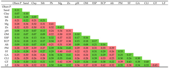 Based on the findings from previous studies and considering the availability and accessibility of relevant data, a total of 18 factors were selected as potential determinants of the ecological risks associated with the total cadmium (Cd) content in avocado plantation soils in Peru. The evaluated soil properties included the soil type, particle size distribution (percentages of sand, silt, and clay), pH, organic matter content, available phosphorus (p), exchangeable sodium percentage (ESP), exchangeable calcium percentage (ECP), exchangeable potassium percentage (EPP), exchangeable magnesium percentage (EMP), and the total concentrations of lead (Pb), magnesium (Mg), and zinc (Zn).