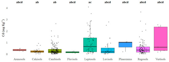 Comparison of total Cd levels across different taxonomic soil types (WRB) cultivated with avocados, based on Dunn’s post hoc test following Kruskal–Wallis test and Bonferroni correction for multiple comparisons. Different letters indicate statistically significant differences between soil types (p < 0.05).