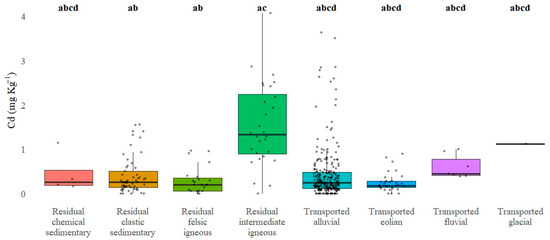 Highly statistically significant differences in the total soil Cd concentrations were observed based on the origin of the parent material (Figure 7). Soils developed from residual parent material derived from intermediate igneous rocks exhibited the highest Cd levels (1.33 mg·kg−1), significantly exceeding those in soils from clastic sedimentary rocks (0.26 mg·kg−1; z = −5.41; p-adj < 0.0001) and felsic igneous rocks (0.20 mg·kg−1; z = 5.36; p-adj < 0.0001). Similarly, soils formed from residual parent material derived from intermediate igneous rocks also showed significantly higher values of accumulated Cd than soils with transported parent material of alluvial (0.24 mg·kg−1; z = −6.43; p-adj < 0.0001) and aeolian (0.18 mg·kg−1; z = −5.90; p-adj < 0.0001) origin.