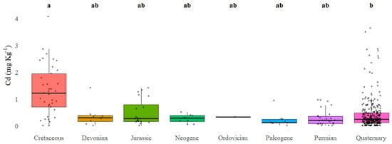 Comparison of total Cd concentrations among different geological ages of parent material in soils cultivated with avocados, based on Dunn’s post hoc test following Kruskal–Wallis test and Bonferroni correction for multiple comparisons. Different letters indicate statistically significant differences between geological ages (p < 0.0001).