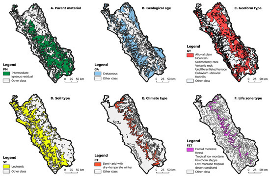 Thematic maps of the categorical strata significantly associated with the distribution of cadmium (Cd) in the soils of the Lima department, as determined from the Geodetector analysis. Six subfigures (A–F) are included, corresponding to the factors of the parent material (PM), geological age (GA), geoform type (GT), soil type (ST), climate (CT), and life zone (FZT), respectively. In each case, the categories whose average Cd incidence was statistically different when compared to other classes of the same factor are shown (White color), highlighting those with higher values. The symbology was standardized, and the maps were created in QGIS 3.40, using the WGS 84/UTM Zone 18S Projection.