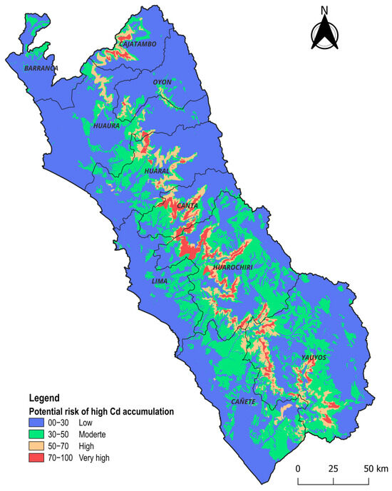 The categories of each factor were weighted according to their respective q-values from the Geodetector analysis and subsequently combined using an additive index, spatially overlaid to identify areas with different levels of risk. This methodology enabled the classification of the spatial risk levels for the occurrence of elevated Cd levels in the Department of Lima. Areas with the highest overlap of high-risk categories were identified as zones of the most significant concern.