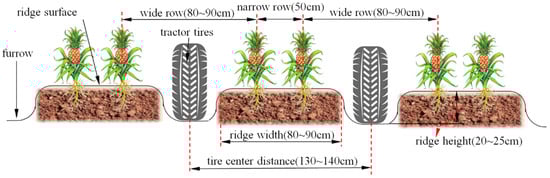 The mechanized pineapple production system employs an innovative ridged cultivation pattern characterized by a triangular staggered arrangement of wide–narrow double rows (Figure 1). This optimized configuration features alternating inter-row spacings of 80–90 cm (wide rows) and 50 cm (narrow rows), with intra-row plant spacing maintained at 25 cm. The ridging parameters include a ridge height of 20–25 cm and furrow-to-furrow distance of 130–140 cm, which ensures compatibility with the wheelbases of mainstream tractor brands.