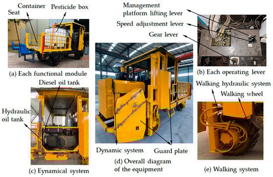 The modular height-adjustable pineapple field management platform (Chinese Academy of Tropical Agricultural Sciences, Agricultural Machinery Research Institute, Zhanjiang, China) is primarily composed of an operator cab, power system, locomotion system, hydraulic systems, chassis frame, and control cabinet. As illustrated in Figure 2, the locomotion system integrates four hydraulic motor-driven ground wheels, with synchronized flow control for front and rear wheels on each side through flow-synchronizing valves. The hydraulic systems for both locomotion and operational functions are strategically installed beneath and within the cab compartment.
