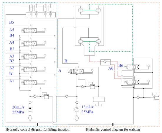 The hydraulic power system is primarily driven by a diesel engine coupled with a hydraulic pump, functionally divided into two distinct circuits: Circuit I for operational hydraulics and Circuit II for travel dynamics. During normal operation, hydraulic fluid is drawn from the reservoir through the pump and subsequently directed to multiple proportional multi-way directional control valves. Among these, one circuit governs four travel motors, enabling precise speed modulation through a high–low speed control lever with analog signal integration, while directional control is achieved via solenoid-operated directional valves.