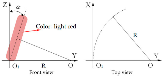 In conventional vehicles, the kingpin is transversely arranged, whereas in high-clearance management platforms, this configuration is replaced by a steering vertical spindle. Consequently, the parameters conventionally referred to as kingpin caster angle and kingpin inclination angle are herein defined as vertical spindle caster angle (β) and vertical spindle inclination angle, respectively. As illustrated in Figure 6, the vertical spindle caster angle α represents the angular deviation between the spindle’s central axis and the vertical ground normal. This critical design parameter facilitates automatic wheel-return torque generation, ensuring operational stability during vehicle motion. While increased α values enhance safety through amplified tire deflection counterforce, excessive angles may lead to increased steering resistance, due to elevated reactive forces opposing wheel rotation.
