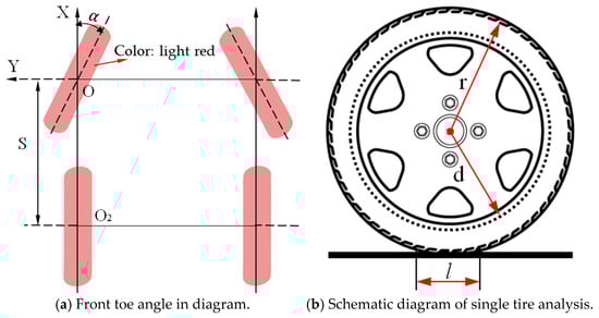 Toe-in configuration, quantified as the dimensional difference between front- and-rear wheel center planes (Figure 5), serves to eliminate lateral slippage during vehicle motion and mitigate wear. The mathematical expression for toe-in calculation Ls is presented in Equation (1):
