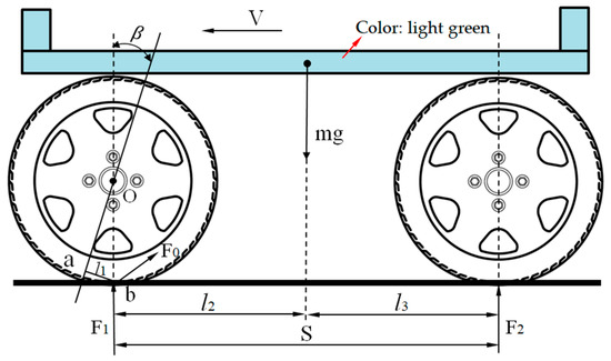 Therefore, optimal caster angles are typically constrained within 3° to balance steering efficiency and stability requirements. The geometric configuration creates a mechanical advantage where the intersection point (a) between the spindle axis and ground plane precedes the tire–ground contact point (b). During steering maneuvers, a centrifugal force (F0) normal to the wheel plane acts at point b, generating a restoring moment (Mβ) about the spindle axis. The moment arm (l1) for this torque corresponds to the perpendicular distance between contact point b and the spindle axis o-a, calculated through Equation (4).